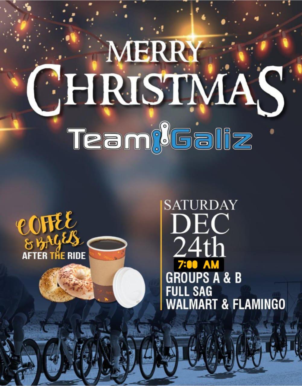 Saturday before Christmas Ride Come and join us for our traditional Christmas ride and have Coffee & Bagels on Us. + Add to Google Calendar + iCal / Outlook export Date Dec 24 2022 Expired! Time 7:00 am - 10:00 am Location Walmart Supercenter 4700 S Flamingo RdCooper City, FL 33330 Website https://goo.gl/maps/p8wZEh1chxaCPLkX8 Share this event